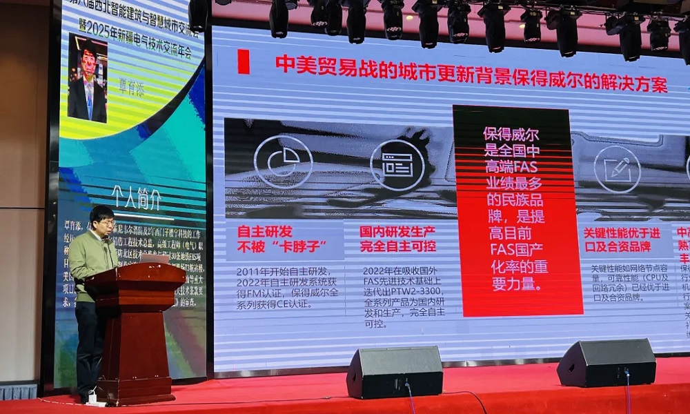 围绕“丝路智联·绿筑未来”,探讨智能建筑与智慧城市的发展方向,分享行业优秀的产品技术方案,保得威尔受邀参会。公司销售总监覃育添发表《城市更新背景下保得威尔消防实施方案探讨》主题巡讲,以硬核技术方案回应行业核心关切。